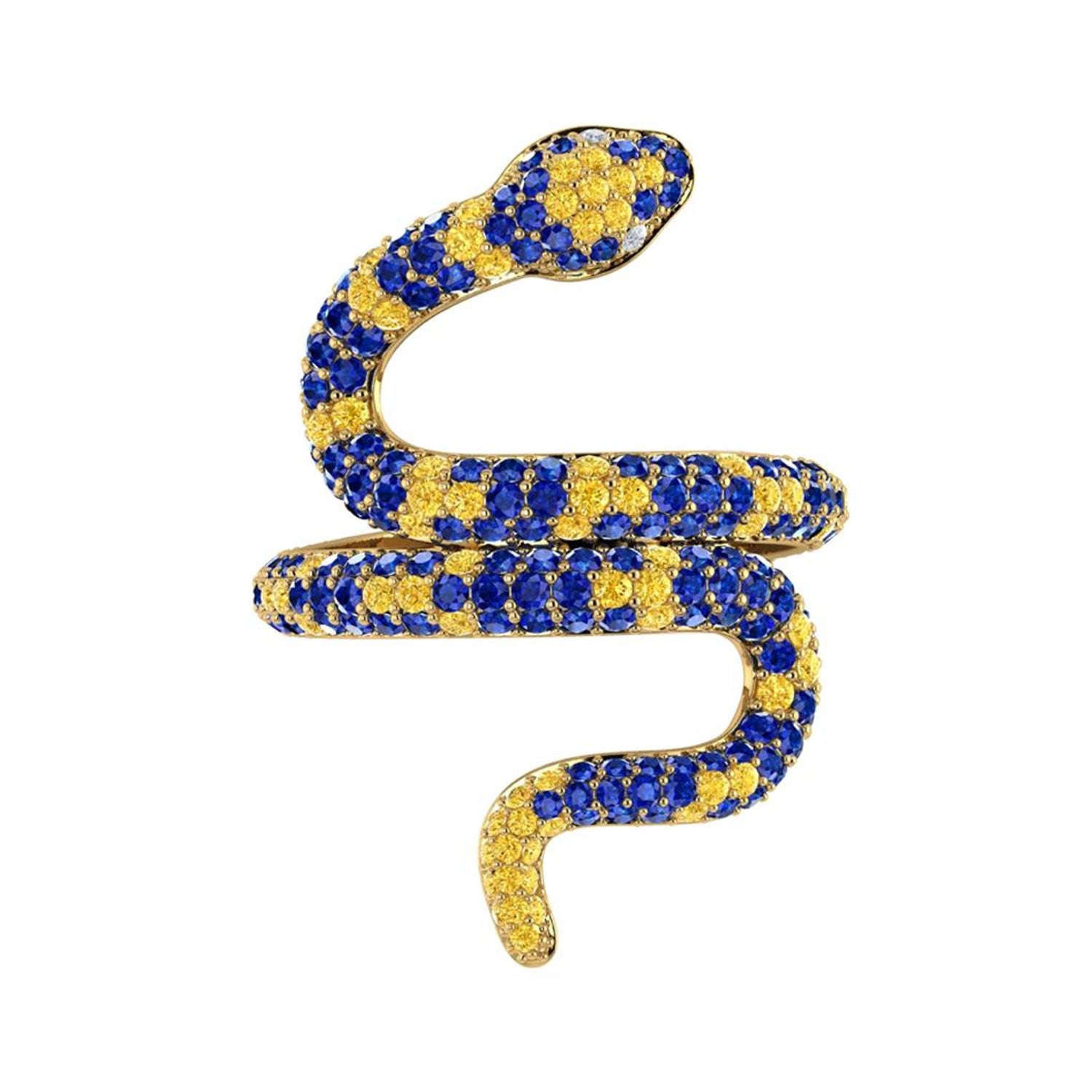 1 35ct Blue And Yellow Sapphires Pave Snake Diamonds 14k Yellow Gold Ring For Sale At 1stdibs